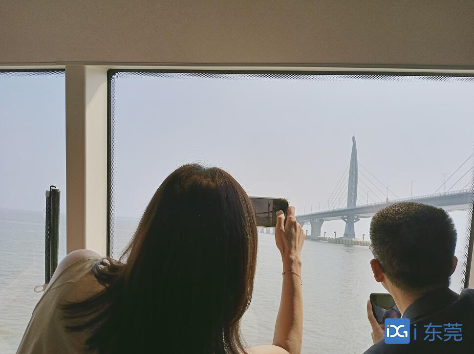 当客轮从虎门港澳码头出发后,开航约75分钟时间,港珠澳大桥则进入眼帘,随着高速客运轮由远及近,独特视角下的港珠澳大桥雄姿让船上的游客禁不住点赞,大家纷纷拿起相机或手机,记录这精美的瞬间:从海上看港珠澳大桥还是第一次,横穿大桥的壮丽景象更是意外惊喜。
